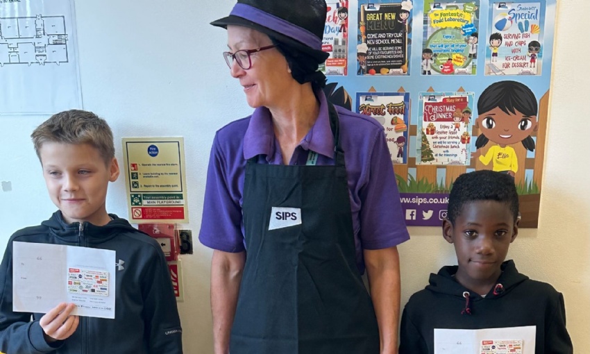 During Census Day on 2nd October 2025, SIPS Catering held a competition, where children had to spot stickers randomly placed on the underside of two pupils' dinner plates. After eating their meals, the two children pictured above spotted they had these special plates. Both children were given gift vouchers by our School Cook, Mrs Cox.